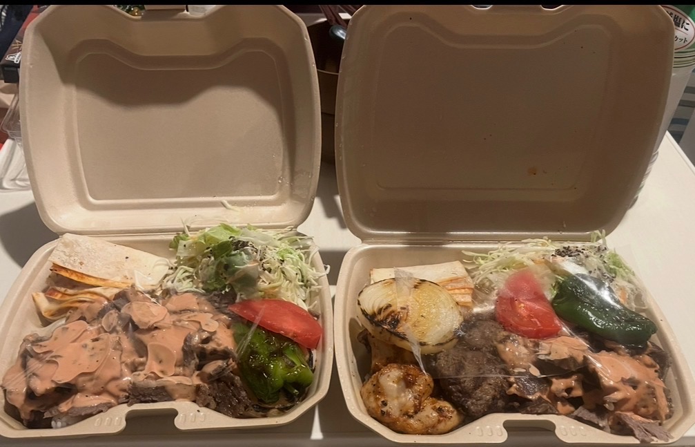 お弁当一個で1,500円くらいでした二つで3,000円、少しお弁当にしたら高いかな、、、、他のケバブとは違い、自分で好きなように包んで食べるスタイルですね。ソースで見にくいですが、お肉が三種類あって牛肉、鶏肉、羊肉ありますが特にオススメなのが羊肉です。多少、癖がありますが肉を食らってる感じがして私は好きです。