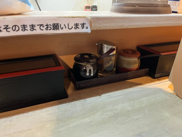 ・卓上:焦がしラー油、魚粉、煮干し酢